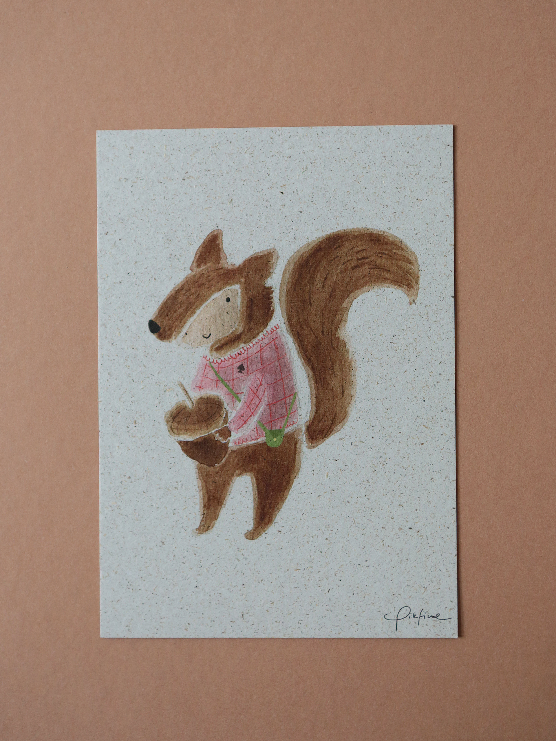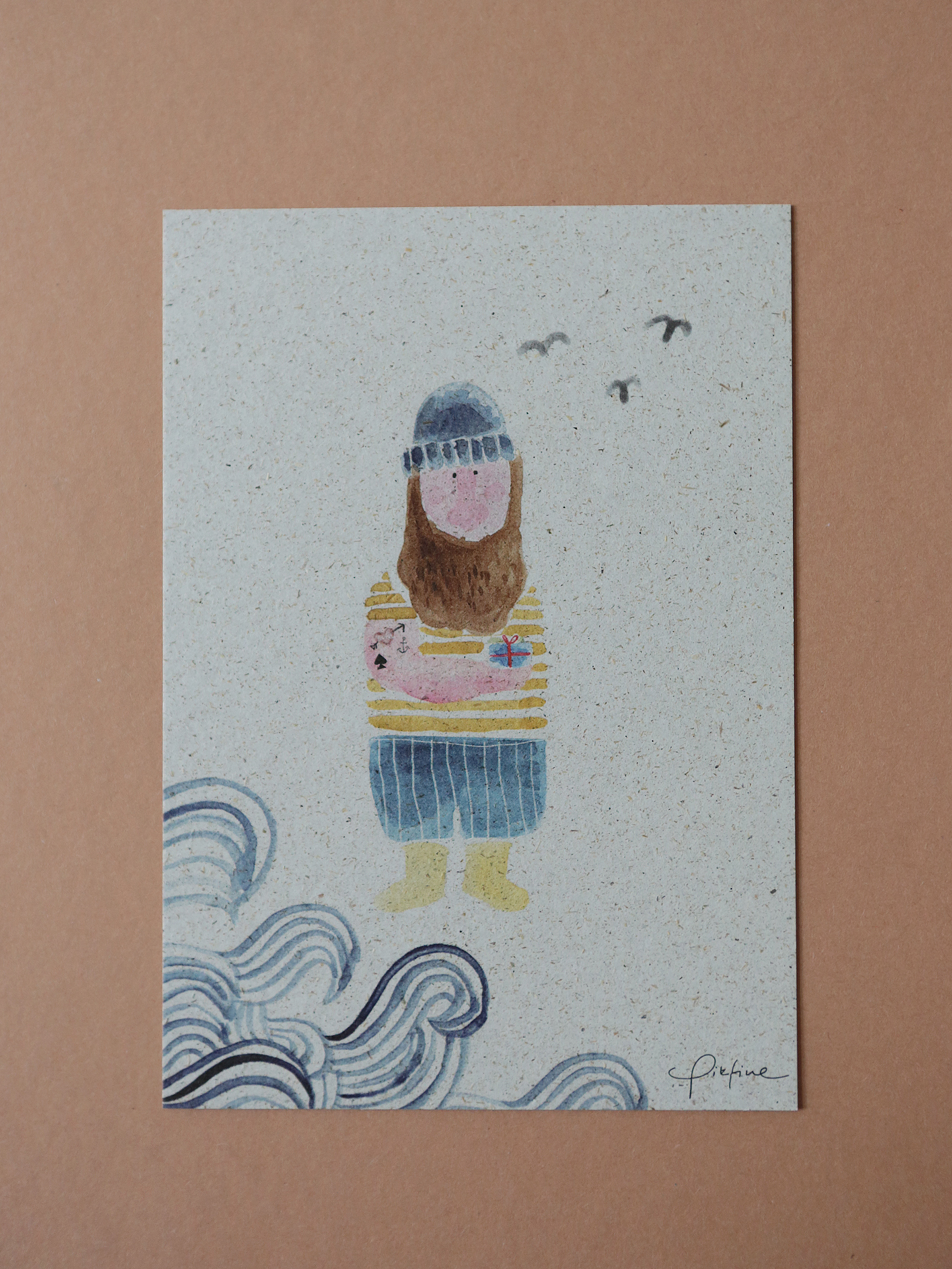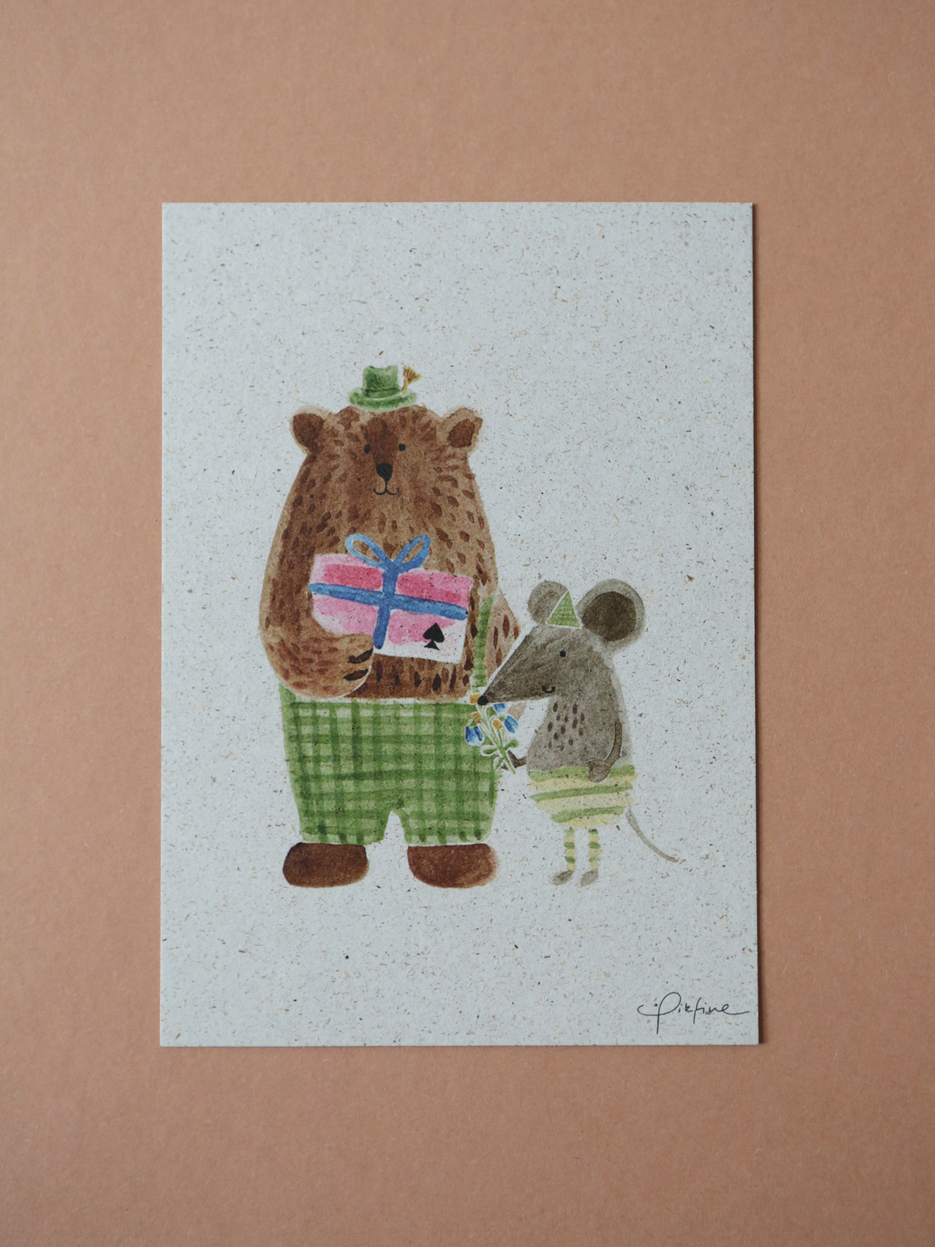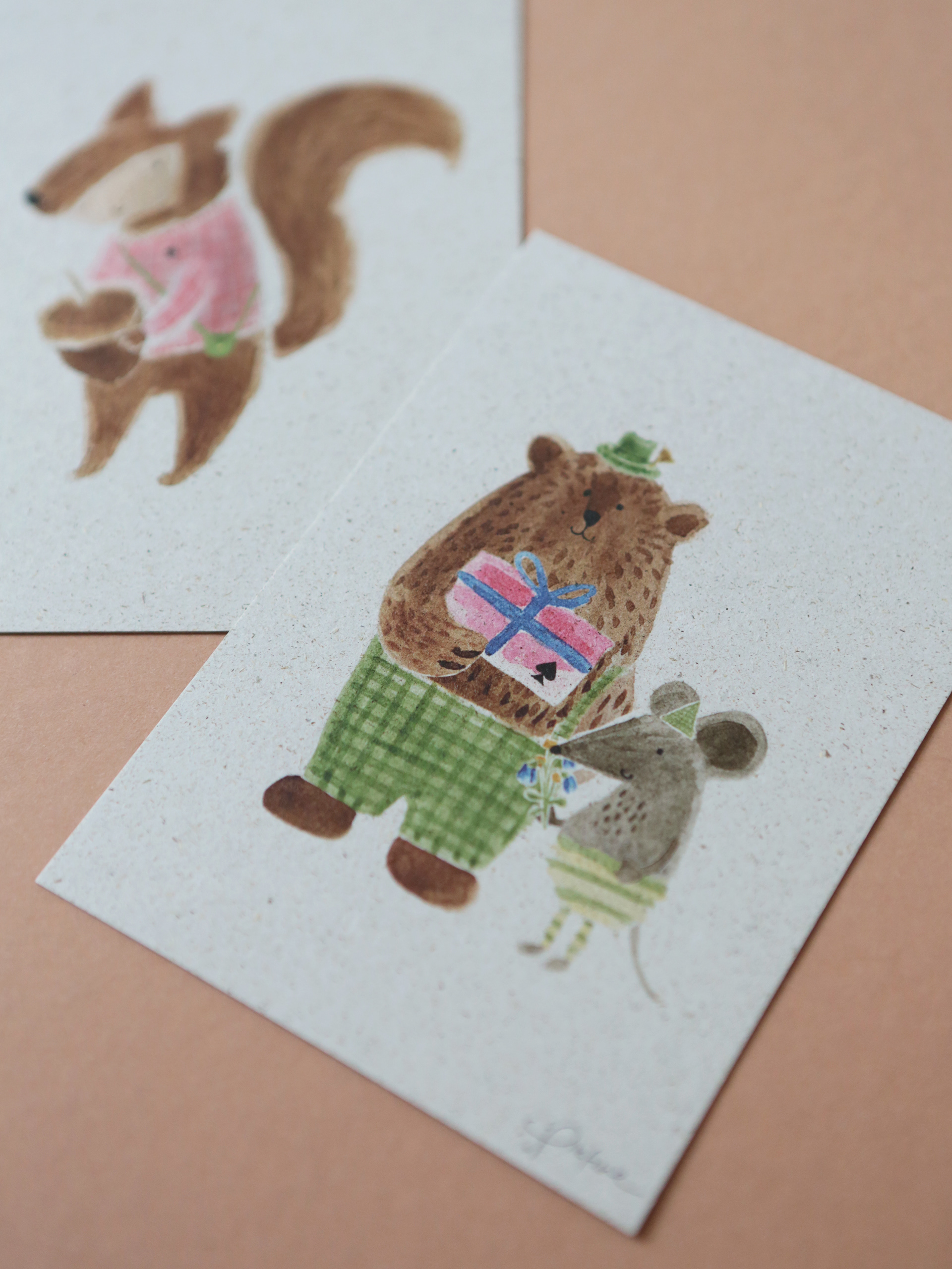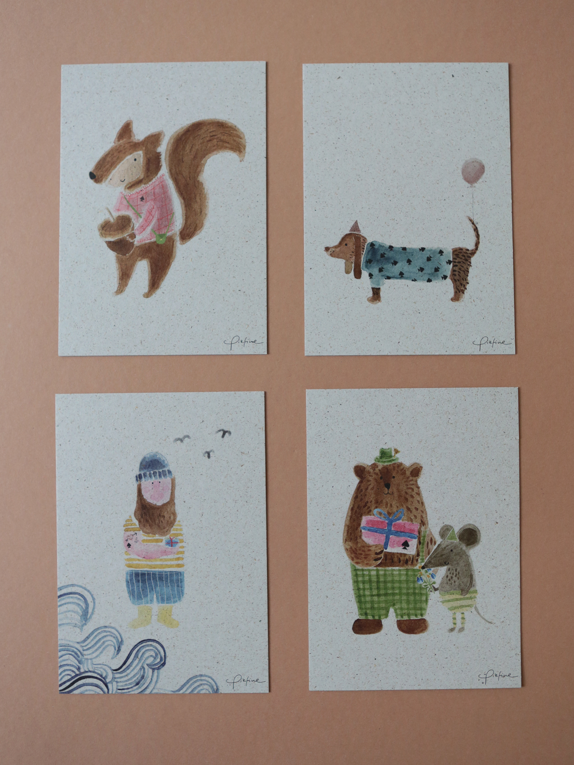 Illustration von vier Postkartenmotiven für die Baby-Geschenkbox.
